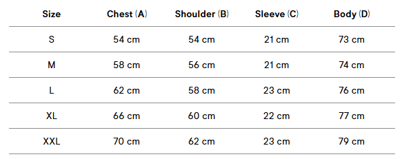 Our T-shirts come with a slightly oversized and longer cut. We recommend choosing one size down for the best fit — they’ll still have a relaxed, slightly baggy feel, but with a more fitted look and shorter length compared to your usual size.
